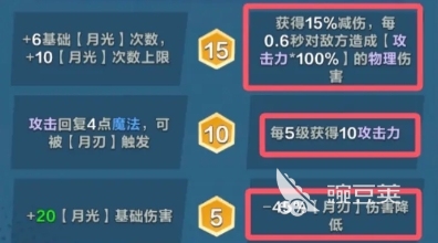 而10级的时候选择右边每5级获得10攻击力,后面15的时候选择获得15%减伤,每0.6秒对敌方造成攻击力100%的物理伤害,月神骑士作为一名典型的普攻英雄,在游戏前期有着独特的发展路径,她可以通过提升普攻等级来迅速积累优势,从而打出连胜的开局,但是如果外面强势连胜英雄过多,那可千万别硬拼,这时候不妨巧妙地蹲到10级,再去寻找合适的时机转连胜。