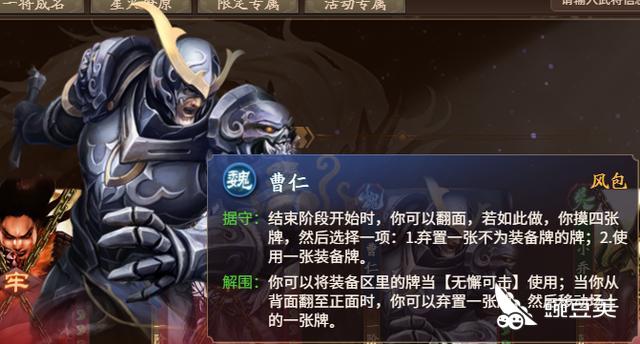 重做后的曹仁2V2嘔心水平也是直逼大乔!就四個(gè)人翻面迅速就過(guò)去,主要是翻回前面時(shí)還可以挪動(dòng)裝備和延遲錦囊,暴發(fā),掌控,防御于一體化的最好武將。然而新殺天梯不清楚是否系統(tǒng)禁用這一個(gè)武將,小編總是沒(méi)選到過(guò)也沒(méi)碰到過(guò)。