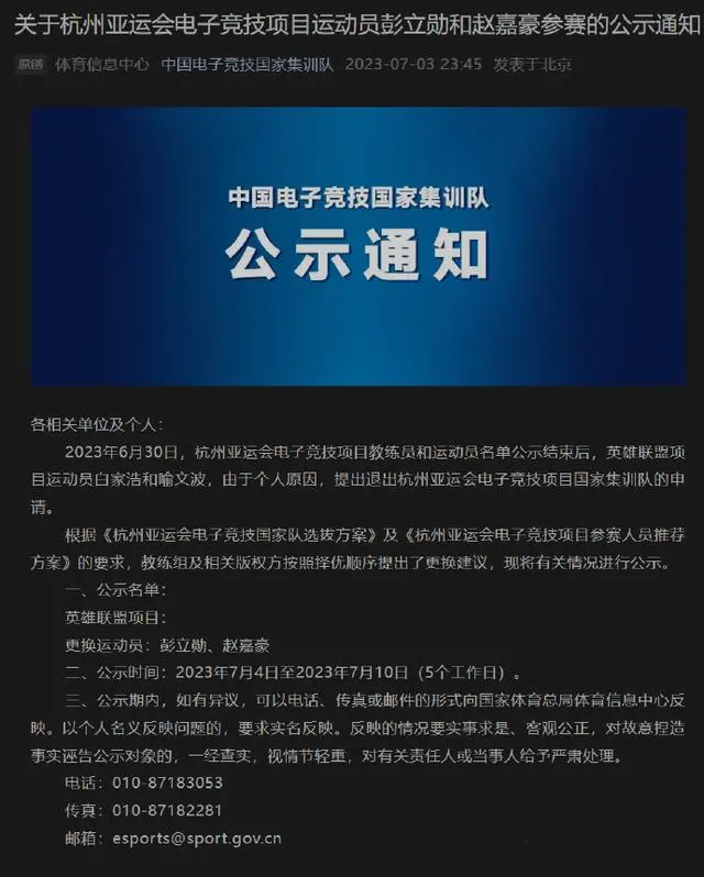 5、随后英雄联盟项目更换运动员:彭立勋(Xun)、赵嘉豪(Elk)。