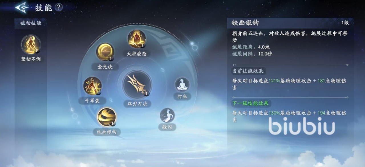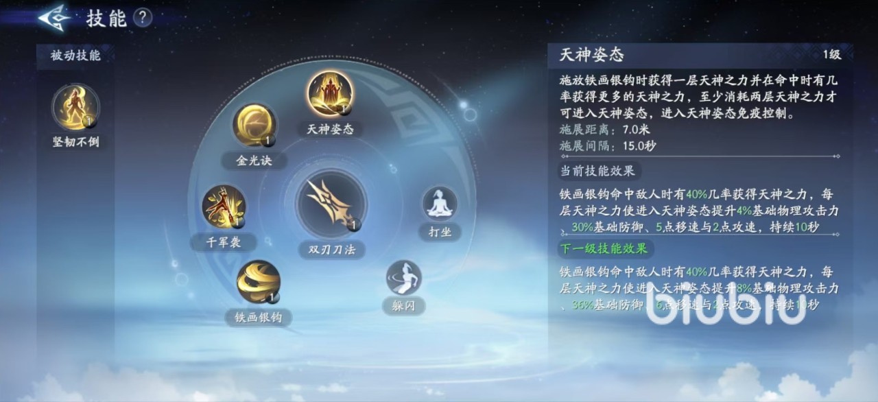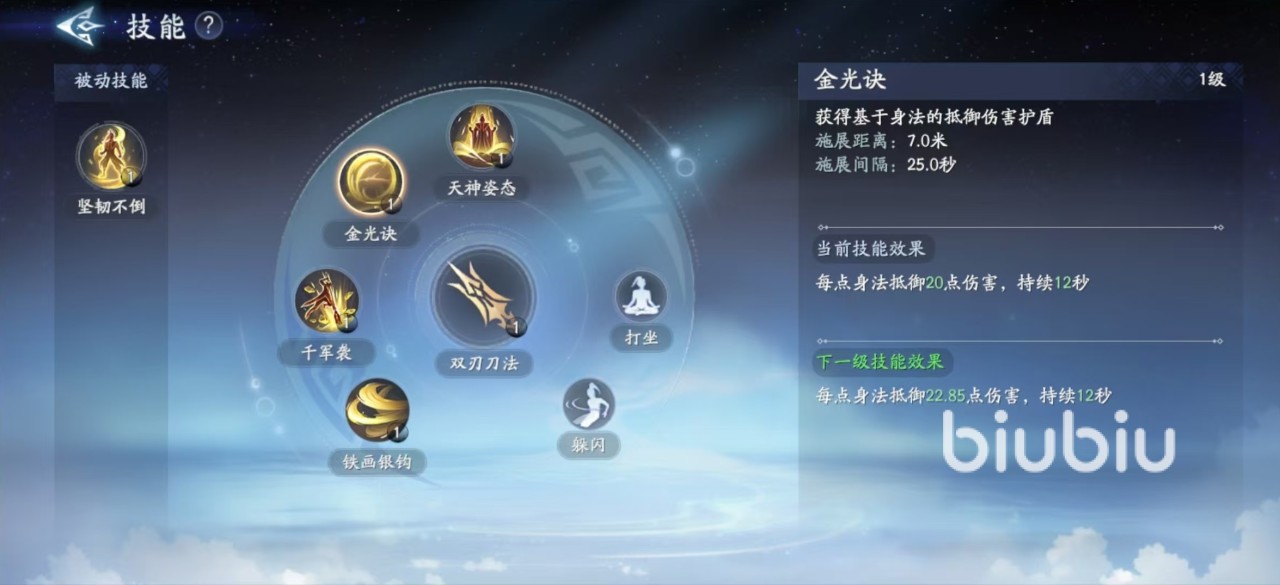 铁画银钩是属于杨戬常用的输出技能,朝身前进行五连击,试展过程中可以进行移动,所以使用起来比较灵活自由。该技能造成的基础物理攻击也比较高,如果能够打满5连击,输出是非常可观的。第3个技能金光决,将获得基于自身身法属性的抵御伤害护盾,技能等级越高,身法带来的伤害抵御效果也就越好。杨戬作为在前方奋战的战士型角色,只有出色的生存能力才能保证承受大量伤害,金光决很关键的技能。