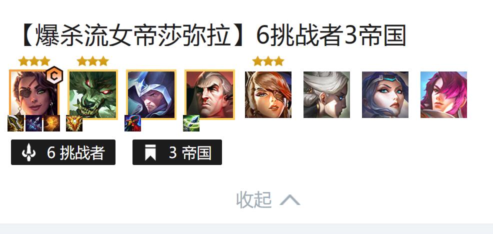 莎弥拉主C,拿无尽,回复(正义饮血),输出装(轻语,巨杀,分裂),如果有回复海克斯就可以不要回复,选三件暴发输出装。这个阵容很吃功能装吹风射线这些装备都能显著提升阵容上限。找完C位装备就可以找功能装。