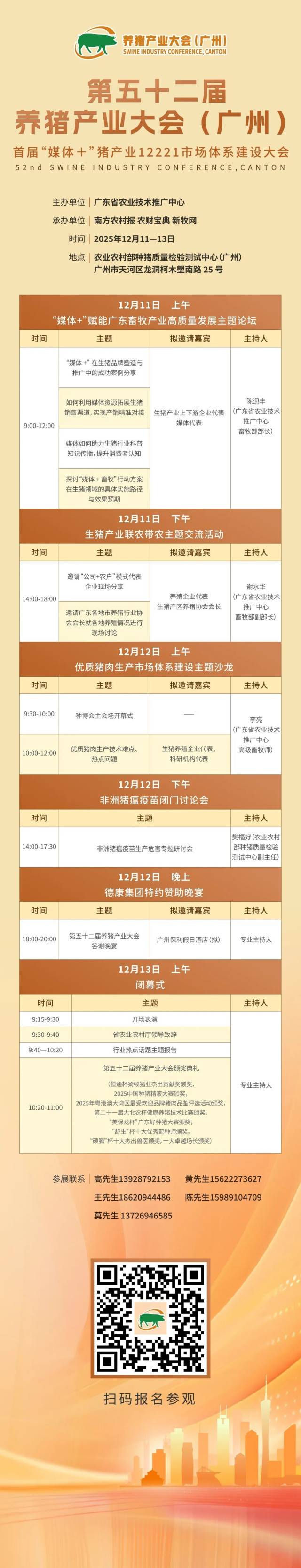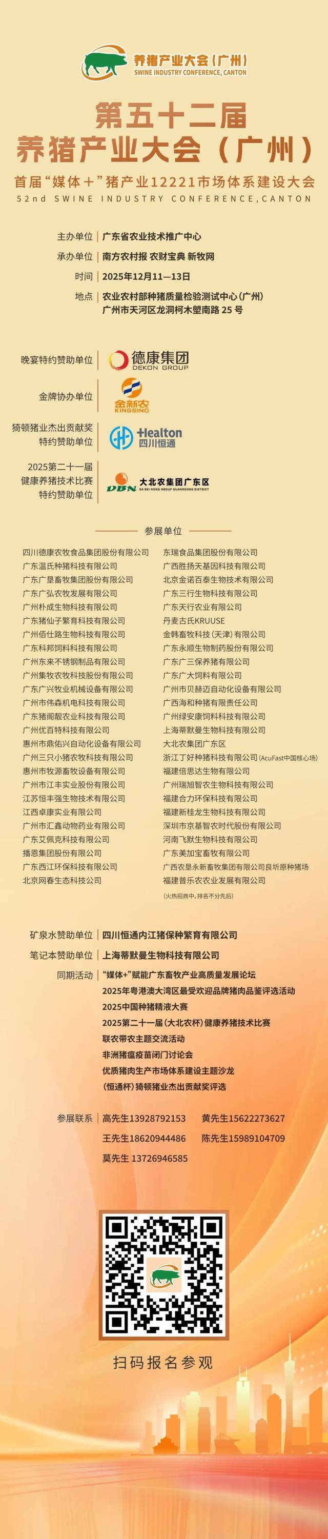 2025年12月11-13日,第五十二届养猪产业大会(广州)暨首届“媒体+”猪产业12221市场体系建设大会将于广州柯木塱农业农村部种猪质量检验测试中心隆重召开。大会同期,2025年粤港澳大湾区最受欢迎品牌猪肉品鉴评选活动将盛大举行。