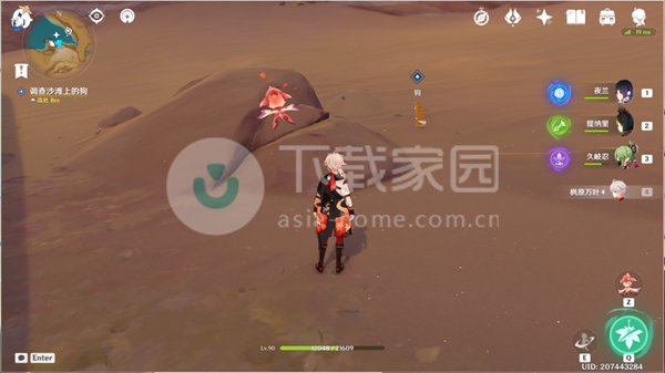 3、原神前往沙滩岩石,漂流找到石头边上的记第狗。