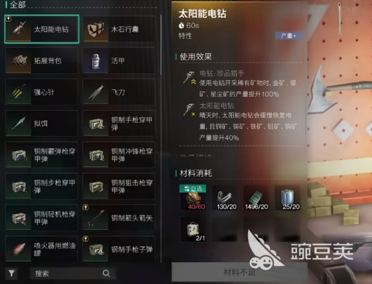 关于材料,太阳能电钻所需的物资并不难获取。除去少量的金矿,其它的材料都可以通过常规的采集或分解获得。若你手头的金矿不太够,可以前往黑心地带专门采集,或者通过与其他玩家交易来补足。收集齐全之后,进入制作台,太阳能电钻便能顺利制作完成。
