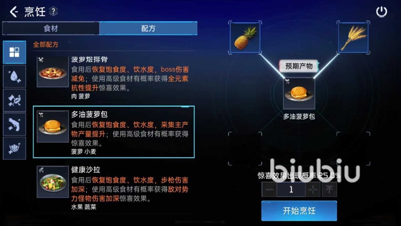 需要的两种食材就是菠萝和小麦,对于这两种大家肯定不会陌生,都是烹饪里的常客。菠萝可以在尖叫戈壁中少量找到,分布范围主要是在绿洲周围,只要能够找到水源,水源附近就有绿洲,多转几圈肯定能够发现,毕竟只是蓝色品质出现几率还是很高。小麦就更简单,自己在家园科技田中买种子种下去就能收获很多,这两种蓝色品质放在一起出现惊喜效果几率为25%。