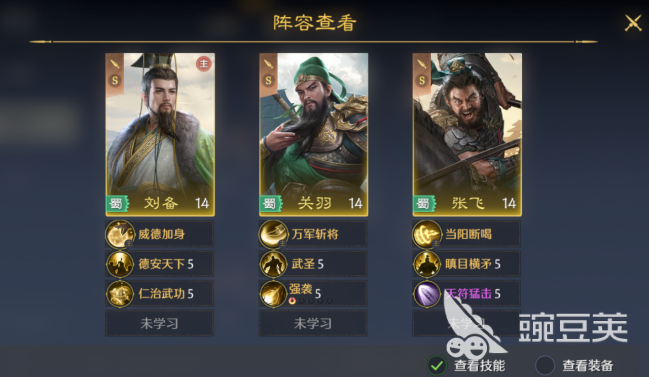 对于愿意花一些资源或者战法储备较高的玩家,刘关张桃园三结义也属于强势的开荒阵容。这套组合容易获得,兵种适配度也较高。刘备为主将的时候,治疗、增伤、减伤等综合属性最强,在开荒阶段最适合;加上关羽的刮骨疗伤、天香战法等,队伍耐久大幅度提高。关羽在队伍中主导权被削弱,可以用重伤、束手、虚弱等方式打乱敌人的节奏。