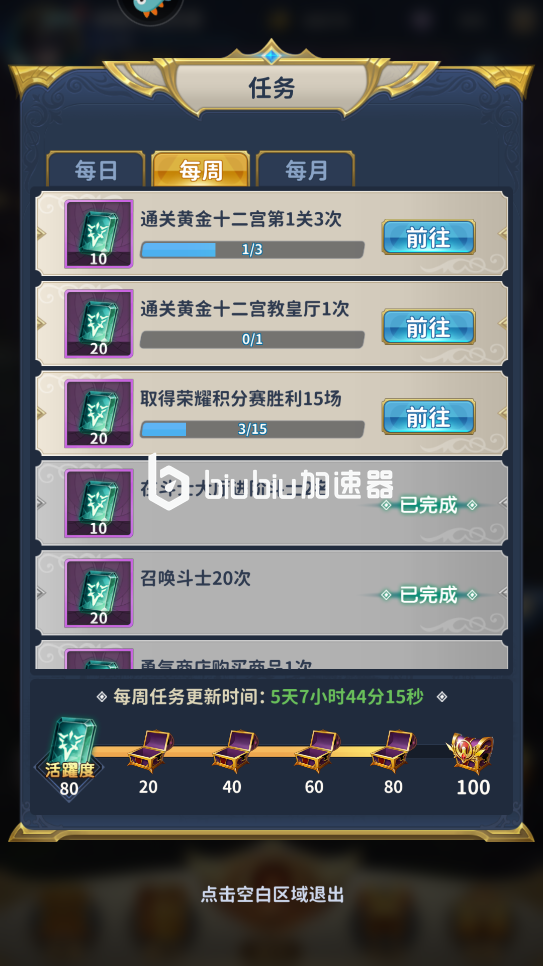 2.完成每周任务。圣斗士星矢正说星石获