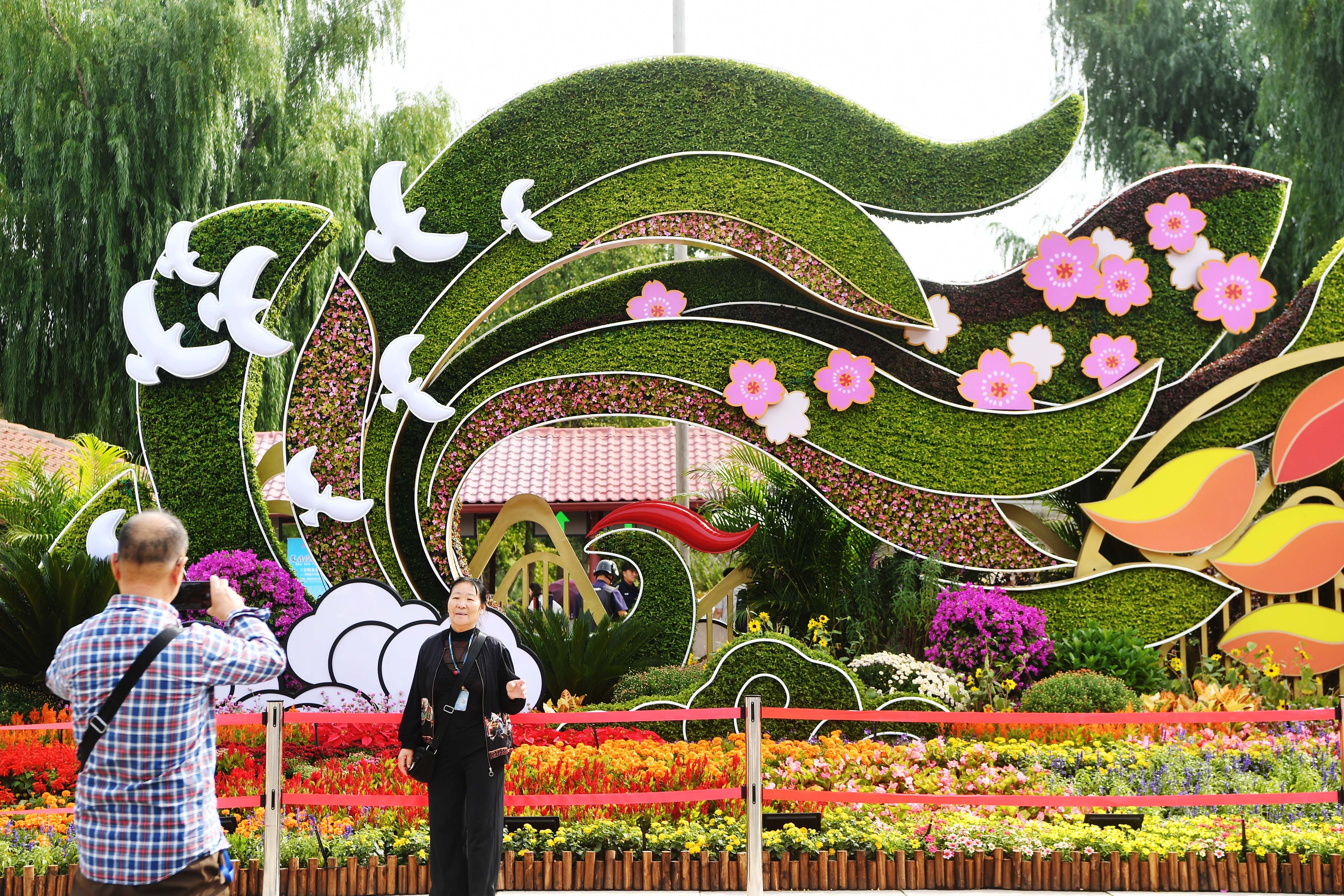游客在玉渊潭公园立体花坛前拍照。新京报记者 薛珺 摄