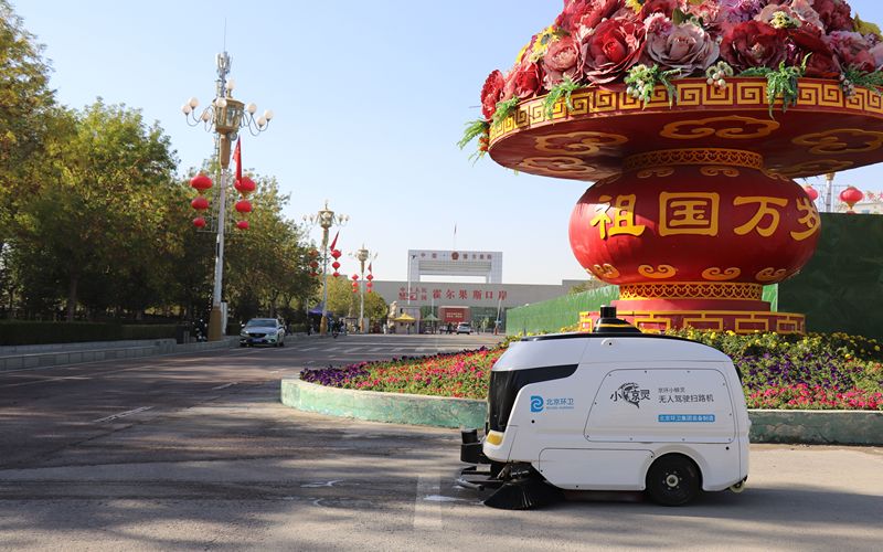 在霍尔果斯国门景区等重点区域,北京环卫集团无人驾驶扫路机“小鲸灵”日均近8小时不间断作业。北京环卫集团供图