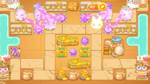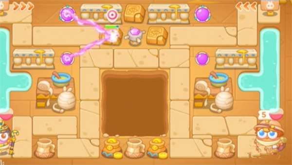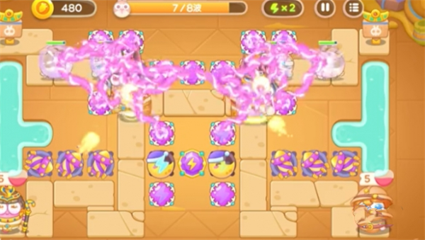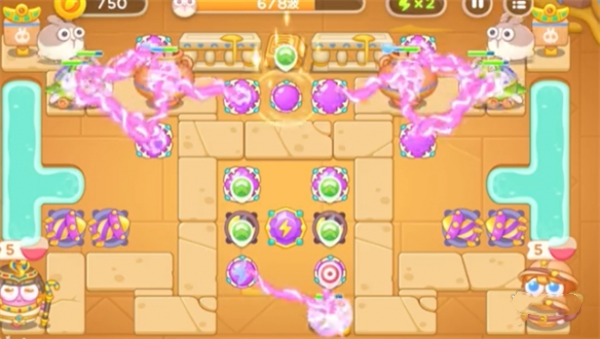3、完成上述部署后,接着运用魔法球强大的攻击力,清理位于中间位置的道具。这一过程需要密切关注道具的防御机制和敌人的干扰,灵活调整攻击策略。清理完成后,迅速在中间区域补充多个满级魔法球炮台,进一步巩固和增强中间区域的防御与攻击能力。