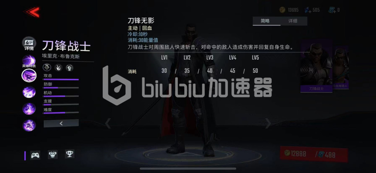 进入游戏之后个玩家就可以在英雄档案界面找到刀锋战士,点击详情我们就可以看到他的技能以及定位。刀锋战士属于一个战斗型英雄,他比较适合独自一人在上路发育,刀锋战士不但拥有强大的伤害能力且还拥有位移技能,如果是在团队没有打野的情况下,刀锋战士也是可以充当打野来使用的,因此在游戏前期想要让刀锋战士发育得好,那么经济就一定要跟得上。