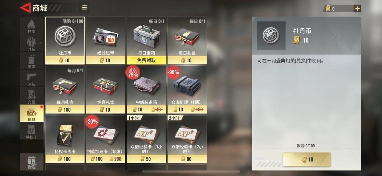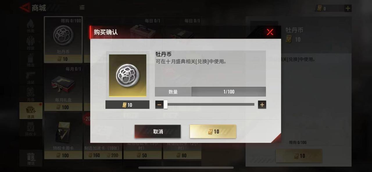 第二种方法是通过商城购买,在活动期间,玩家可以在商城界面找到道具板块,在道具板块内玩家能看到牡丹币的购买链接,平均10个点券可以购买一个牡丹币。
