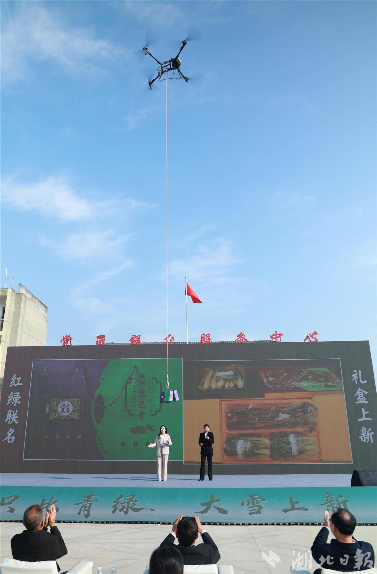 无人机把“一红一绿”的礼盒运到舞台上(随州泡泡青与洪山菜薹“一红一绿”联名计划),力争用最快的物流,最大程度的保鲜,把“新鲜”送到家。