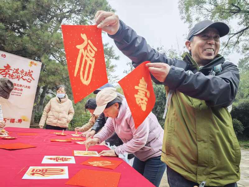 现场提供了“福”“寿”字模板,搭配金粉、宣纸与拓包,游客可蘸取金粉拓印在纸上。公园延续游山会经典传统,为老年游客免费限量发放由重阳糕、茱萸囊、菊花茶组成的 “重阳三宝”。