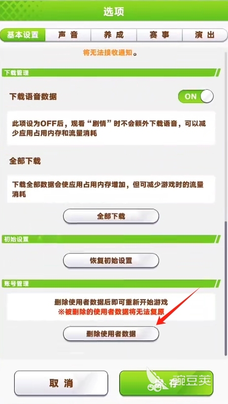 点击基本设置这一栏,然后一直往下面翻,翻到最底下就能看到“账号管理”,点击它下面的“删除使用者数据”,之后会弹出一个提示问你是否确认删除,毕竟删掉之后是不能恢复的,如果执意要转生的话那么直接确定即可。