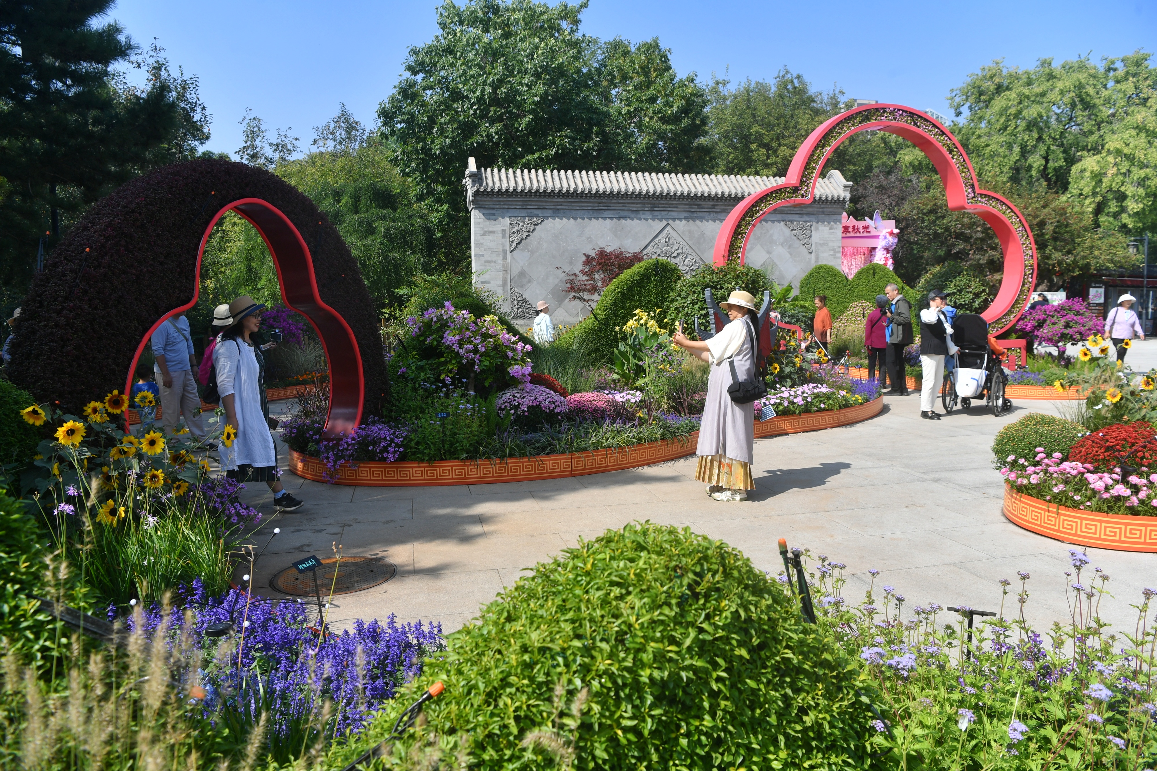 游客在东门“叩秋扉”花坛拍照留影。新京报记者 薛珺 摄