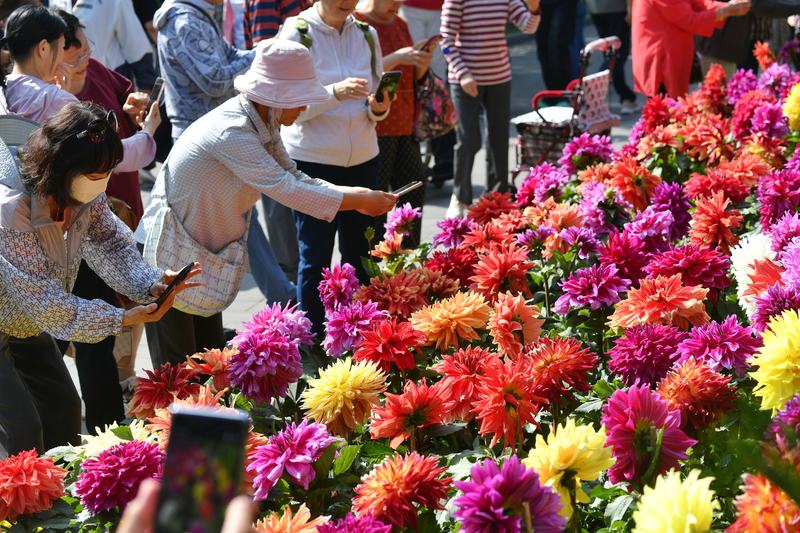游客拍摄盛开的秋花。新京报记者 薛珺 摄