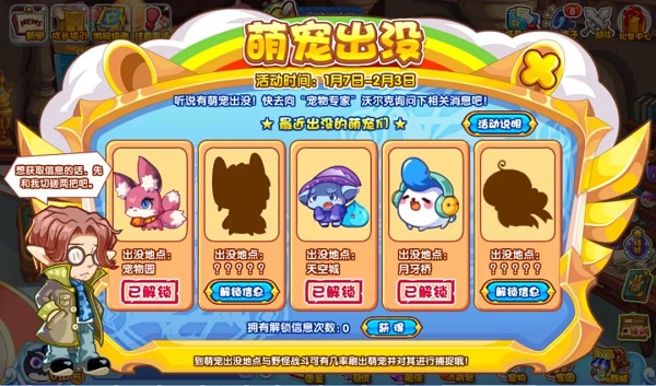 2、洛克然后可以利用挑战获得的王国次数,去解锁宠物出没消息;