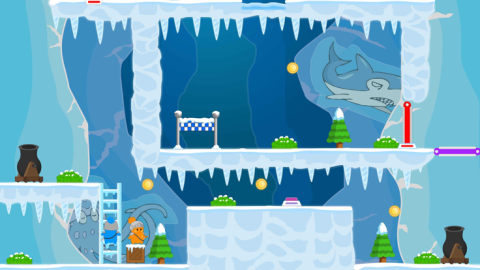 这是一款双人协作横版闯关冒险游戏,玩家分别扮演一只黄猫和一只蓝猫,需要双方协力合作解决关卡中的各种陷阱、机关,同时收集金币,打败boss。相比单人闯关游戏,本作中专门设计了很多双人合作才能解开的机关,比如需要同步踩下的开关,需要搭人梯才能上去的高地,必须交替前进的门等等。同时在boss的设计上也增加了一些针对双人模式的弱点,比如画面两侧需要同时按下的机关,以及需要一人勾引才会暴露的弱点等等。