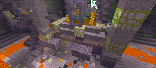 楼梯上与之相接的小遗址全都是宝藏与伤害共存。例如这儿的蓝钻矿与危机四伏的火药桶岩浆。