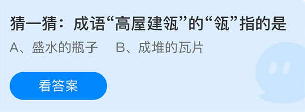 支付宝蚂蚁庄园小课12月20日的其中一个问题是:猜一猜:成语"高屋建瓴”的“瓴”指的是?这道题考查高屋建瓴有关的知识,下面一起来看一下蚂蚁庄园12月20日的正确答案吧。蚂蚁庄园小课堂12月20日问题答
